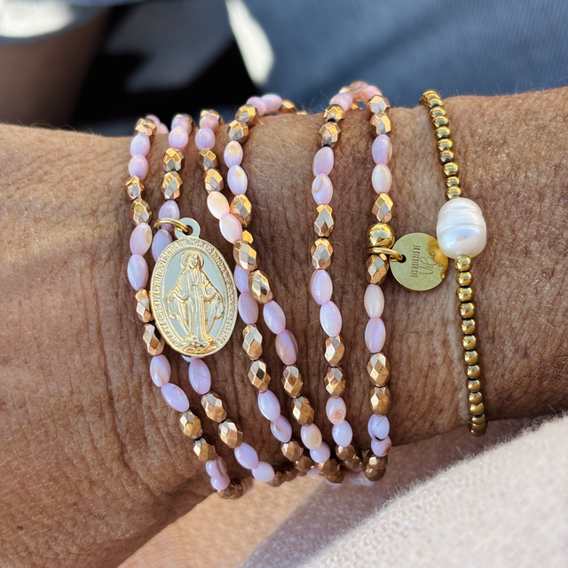 Composé d’hématite or rosé, de perles de coquillages roses et d’une médaille miraculeuse en plaqué or.