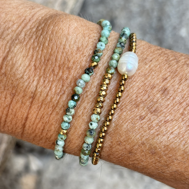 Le bracelet Constellation est composé de pierres naturelles, ponctuées de perles dorées minérales réparties harmonieusement tout autour du bracelet, créant un effet étoilé délicat.
