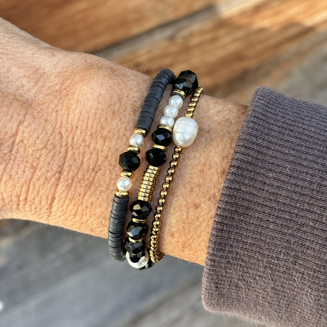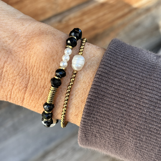 Le bracelet Cristal Noir associe l’éclat lumineux des perles de verre noires au contraste délicat des perles nacrées blanches et des disques dorés. Monté sur un élastique résistant, il offre élégance, confort et durabilité.