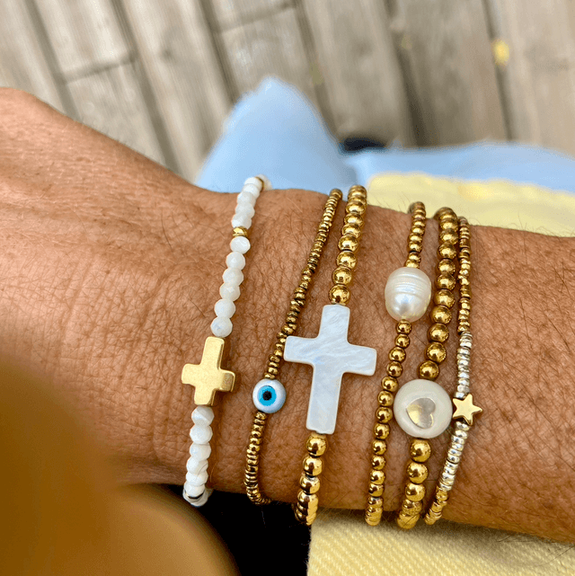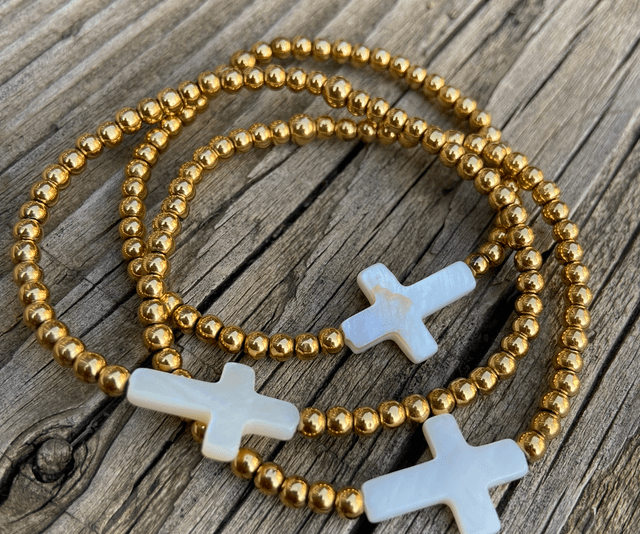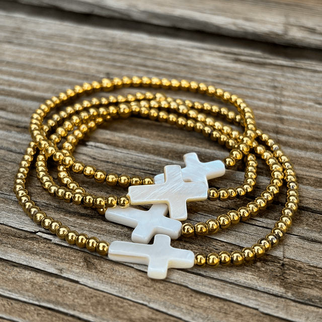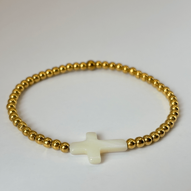 •Bracelet en perles hématite dorées, ornée d’une croix en nacre