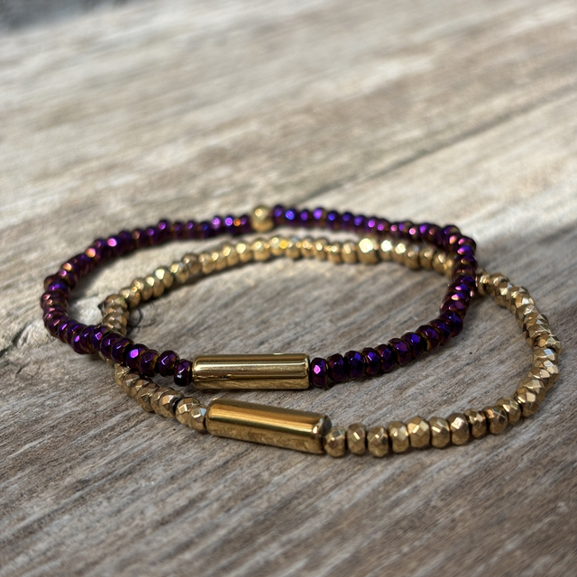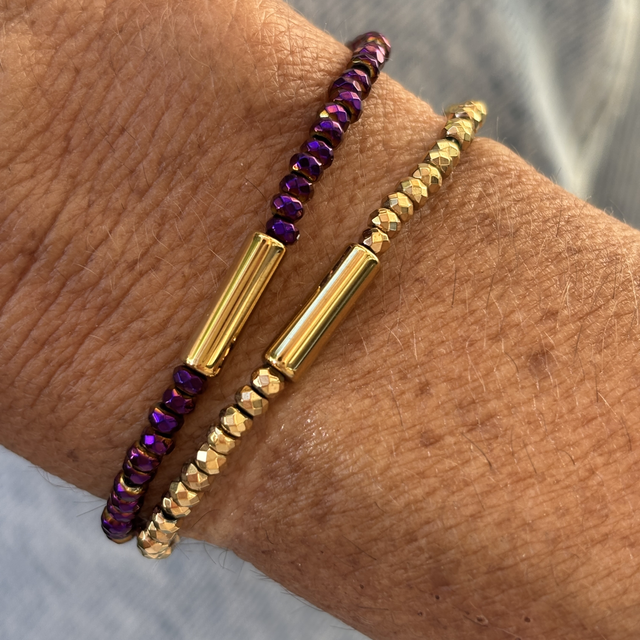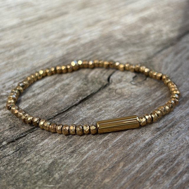 Un bracelet élégant en perles d’hématite facettées, sublimé par un tube central doré pour un éclat subtil et raffiné qui s’adapte à toutes les occasions. ✨