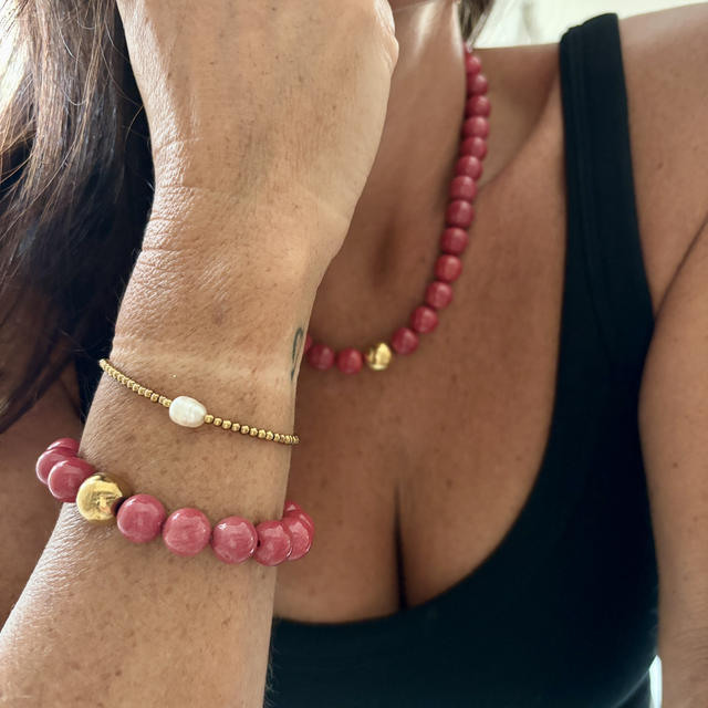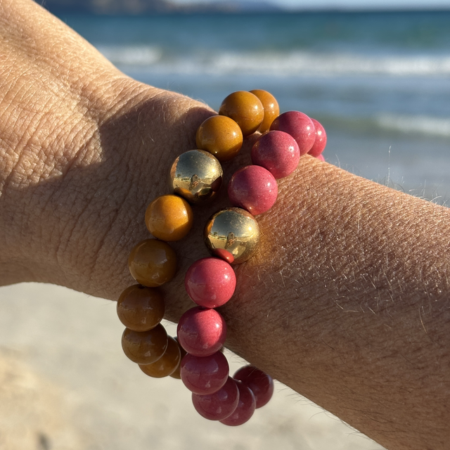 Le bracelet Vertige reprend l’allure vibrante du collier du même nom : des pierres teintées aux nuances intenses, mises en valeur par une perle dorée minérale centrale. Un design graphique, coloré et facile à porter au quotidien.