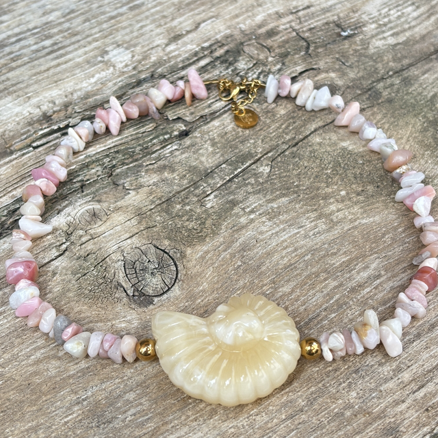 Un bijou lumineux et solaire, mêlant la douceur des pierres naturelles à l’éclat du coquillage central.