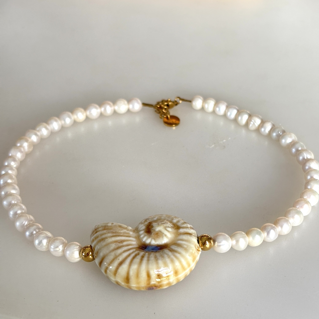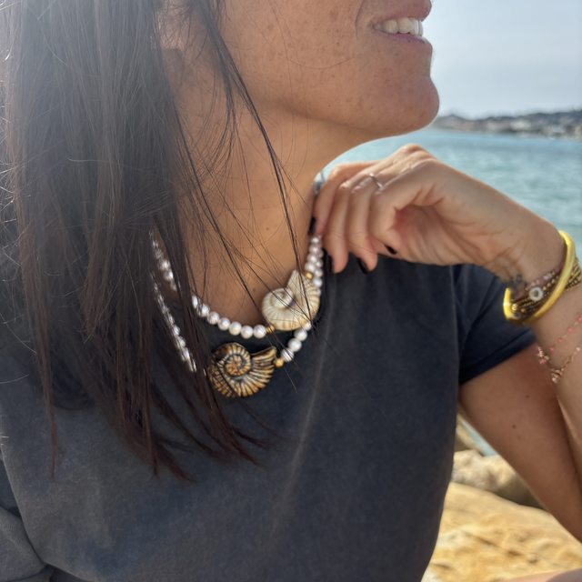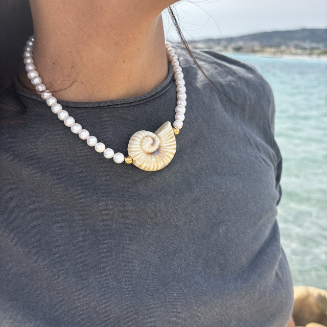 Le collier Ursula version perles d’eau douce évoque la légende marine où la voix de la sirène sommeille dans un coquillage précieux.