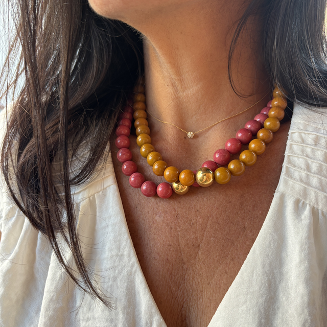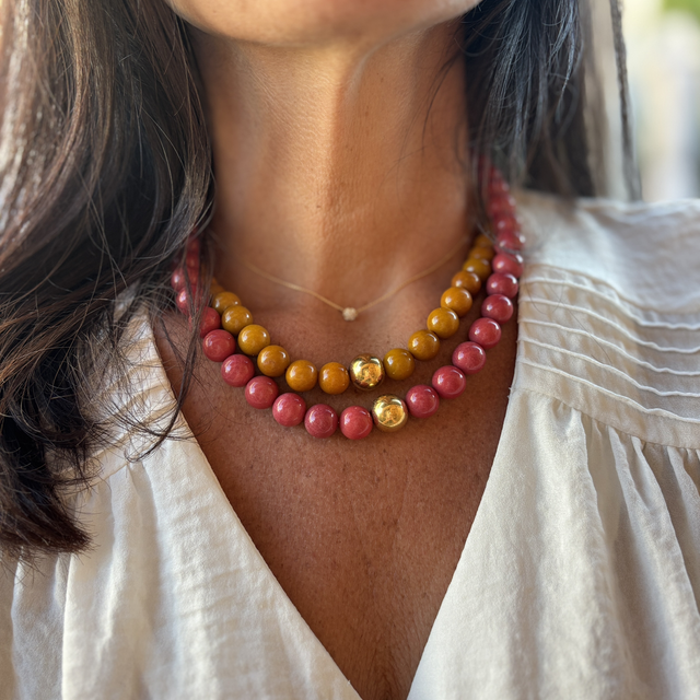• Perles rondes en pierre jaspe teintée (coloris au choix : kaki, camel ou corail)