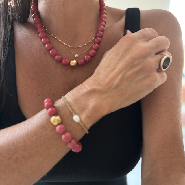 Un bijou au charme magnétique. Ses perles pierres teintées, sublimées par une touche dorée, se posent sur la peau comme un éclat de lumière.