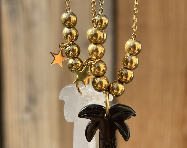 Ce sautoir associe la brillance des perles en hématite à un élégant pendentif palmier taillé dans une pierre naturelle. Monté sur une chaîne en acier inoxydable, il capte la lumière et invite à l’évasion, comme un clin d’œil aux vacances, au sable chaud et aux palmiers dansants.